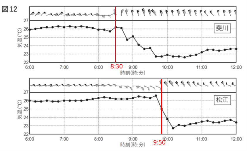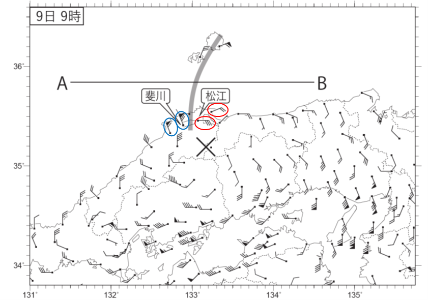 シアーラインの東側は東よりの風、西側は北よりの風であることがわかっているので、シアーラインが通過すると、東よりの風から北よりの風となると推測できます。斐川では、8時30分に東よりの風が北よりの風に変わり、松江では9時50分に同様の変化をしていますので、斐川と松江のシアーラインの通過時刻はそれぞれ、830分と950分です。