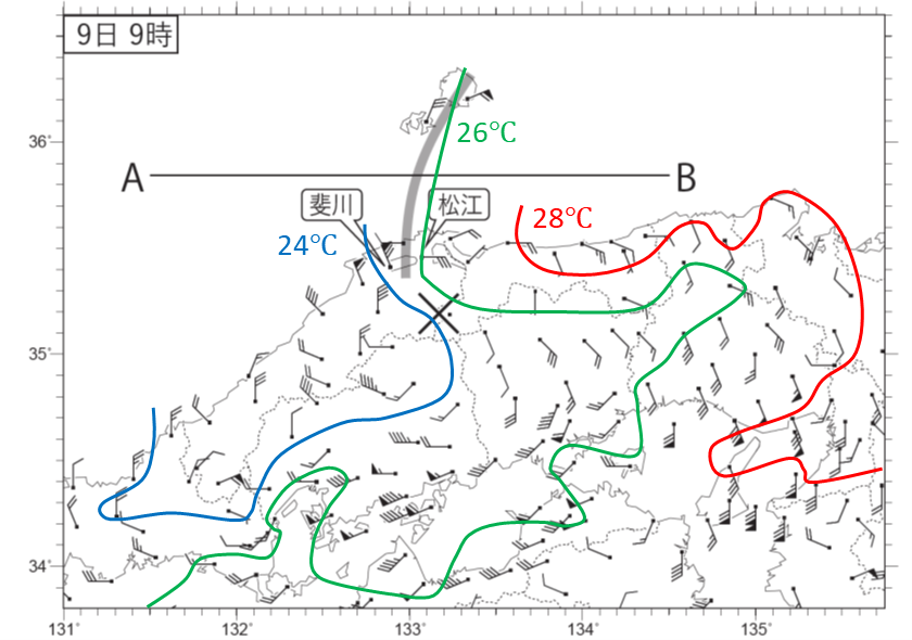 シアーラインのある山陰沿岸部では、西側に東側に向かって24℃の等温線から28℃の等温線の間隔が狭く集中しています。この状況をまとめると、