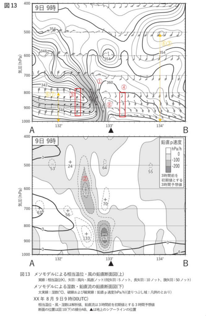 ②図13(上)の図の等相当温位線収集帯の東側付近は、図13(下)の図では最大‐211hPa/hの強い上昇流域となっています。