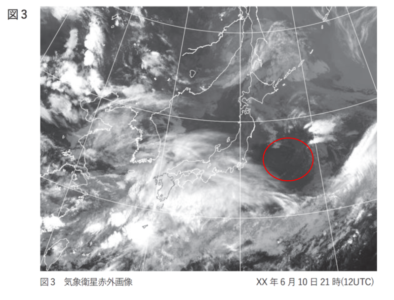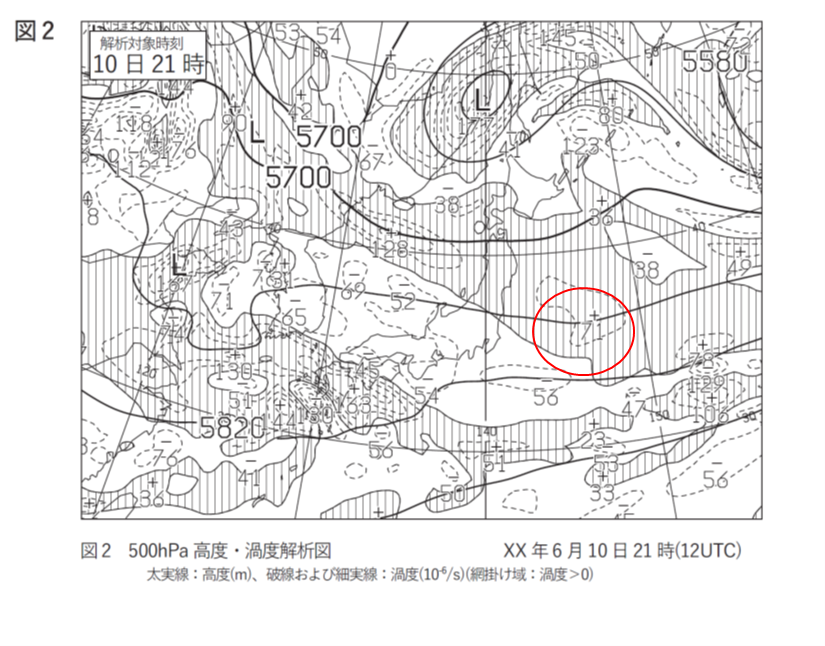 晴天域は正の渦度域に位置することがわかります。しかし、晴天になる理由を答えるので、正の渦度域であるというのは理由になりません。この晴天域の西側に負の渦度域があり、これが晴天をもたらしていると考えます。一般的に、西側に正の渦度域があると低気圧が発達し、天気が崩れるのと同じく、西側に負の渦度域がある(負の渦度移流域である)のであれば、晴天の傾向となります。よって、