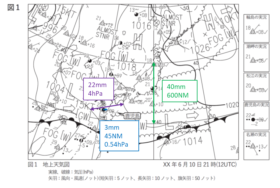 北緯30°から40°の600海里地図上の距離が40mmなので、45海里は地図上で3mmとなります。またこの付近の東北東ー西南西方向の等圧線4hPaの間隔は22mmなので、鹿児島から3mm(45海里)東北東に離れた地点は4hPa×3mm/22mm=0.54hPaの気圧差があることがわかります。