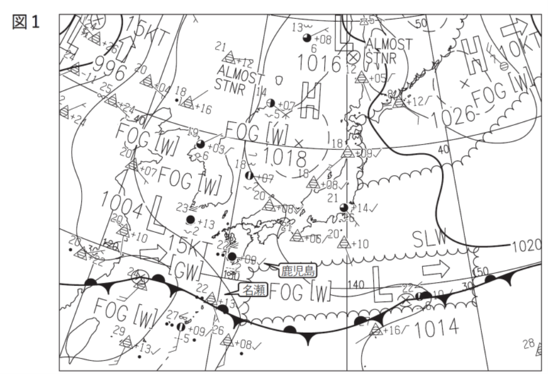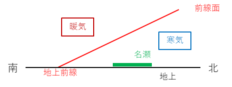 名瀬付近に停滞前線が東西に横断しています。この停滞前線の構造は、一般的な前線の構造から考えると南側の暖気が北側の寒気に乗り上げるような構造となっているはずです。②より、名瀬の上空に前線面があることから、断面を切ると下の図のようになります。
