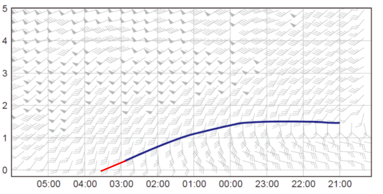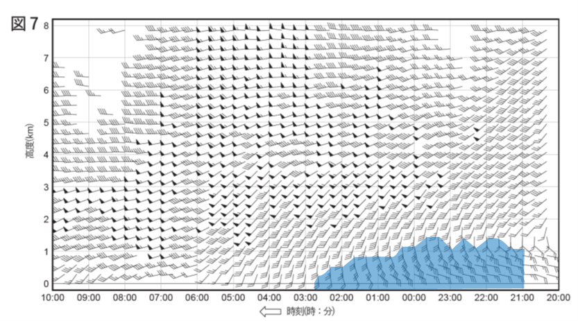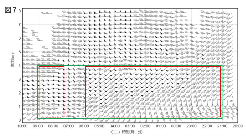 条件に示された10日21時から11日9時の範囲を緑で囲んでいます。その中で、上層に向かって風向が時計回りに変化しているのは赤で囲んでいる部分になります。よって、暖気移流となっているのは、この時間帯であり、10日21時0分から11日5時40分と、11日7時20分から11日9時0分となります。