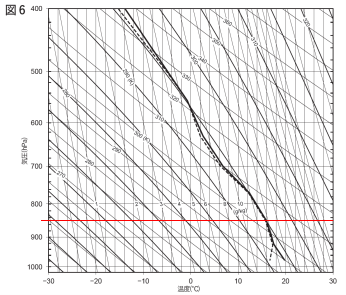 上の図で示した赤線の高度850hPaで、気温のグラフの傾き(気温減率)の変化点が見られます。