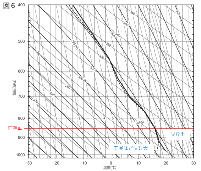 よってこの850hPa付近が、前線に起因する安定層の上端と考えられるため、前線面の高度はこの850hPaとなります。