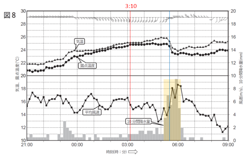 気温については、(1)⑥で触れた前線の北側の暖気移流によりそれまで上昇していた気温の変化が、3:10ごろからは、変化がほとんどなくなっています。