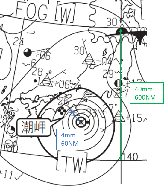 台風の中心から潮岬までの距離は、地図上で4mmです。北緯30°から40°までの600海里の距離が地図上では、40mmということから、台風の中心から潮岬までの実際の距離は60海里だとわかります。6ノットの速さで進行すると、10時間で潮岬に到達します。