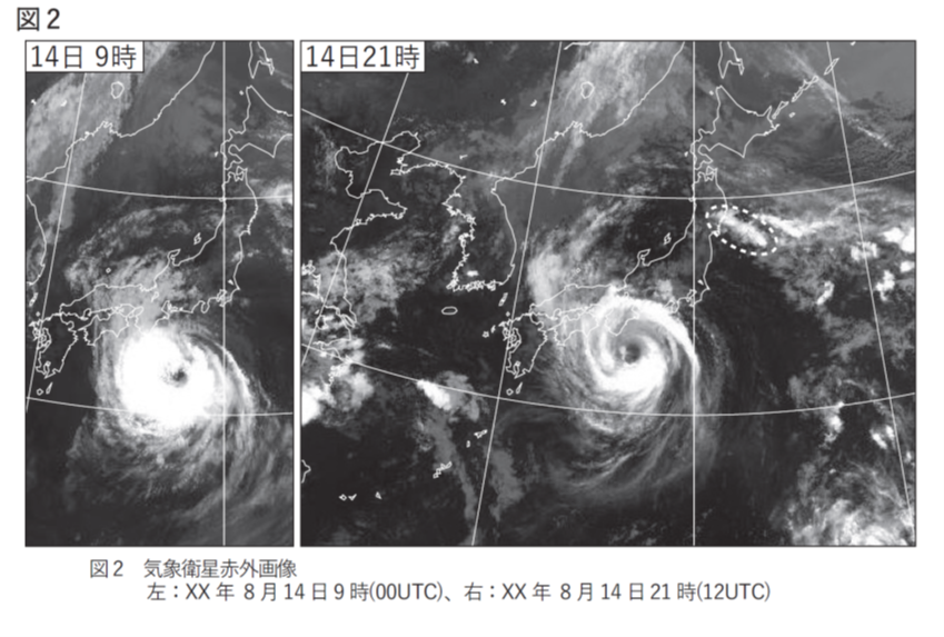 図1の英文のところの記載から、風速30ノット(≒15m/s)以上の半径は、東側で180海里、西側で150海里となっています。1海里は約1.85kmなので、この台風の風速15m/s以上の半径は500kmには及ばず、強さを表現しません。答えはとなります。