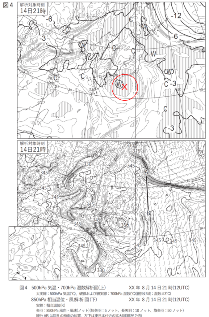 次に500hPaと850hPaの気温の分布についてです。図3と図4にて、台風の中心付近にWと書かれた領域が等温線に囲まれています。この部分は周囲より気温が高いことになります。これについても20字程度で簡潔にまとめますと