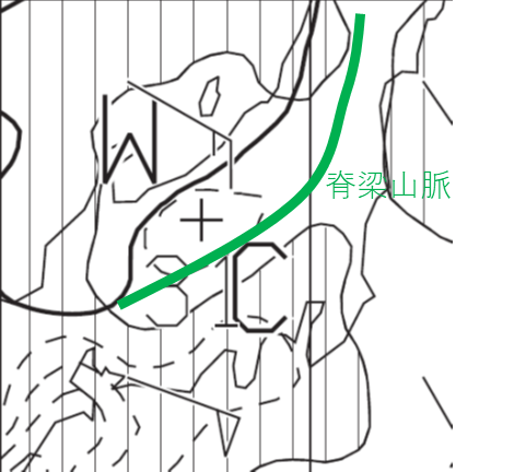 脊梁山脈を挟んだ大気の特徴についてです。脊梁山脈とは、大陸や島を縦断や横断するように伸びた背骨のような山脈です。日本列島で言えば、東北地方の奥羽山脈や中部地方の日本アルプスが該当します。図3の拡大図に落とし込むと下の図のようになります。