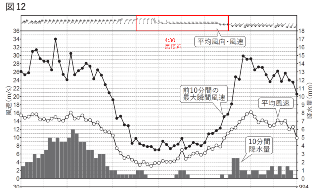 図12よりの台風が潮岬に最も接近した4:30前後の風向の変化をみると、北よりから西よりへと左回りの変化となっているので、潮岬は台風進行方向の左側となります。台風はおよそ北方向に進行していますので、潮岬は台風中心の西側にあるということになります。よって問題文のとおり主語を逆転させると台風の中心は潮岬の東側を通過したことになります。