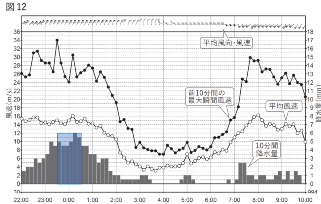 ②台風の接近前の時間帯のほうが気圧が低く、また、降水量も多く、風も強いです。地形の影響がないとすれば、2時間の間に、台風中心が潮岬に近づいたことによる影響以上に、台風が弱まったと言えます。