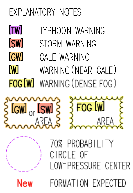 国際天気図では、下記のように海上警報を表します。