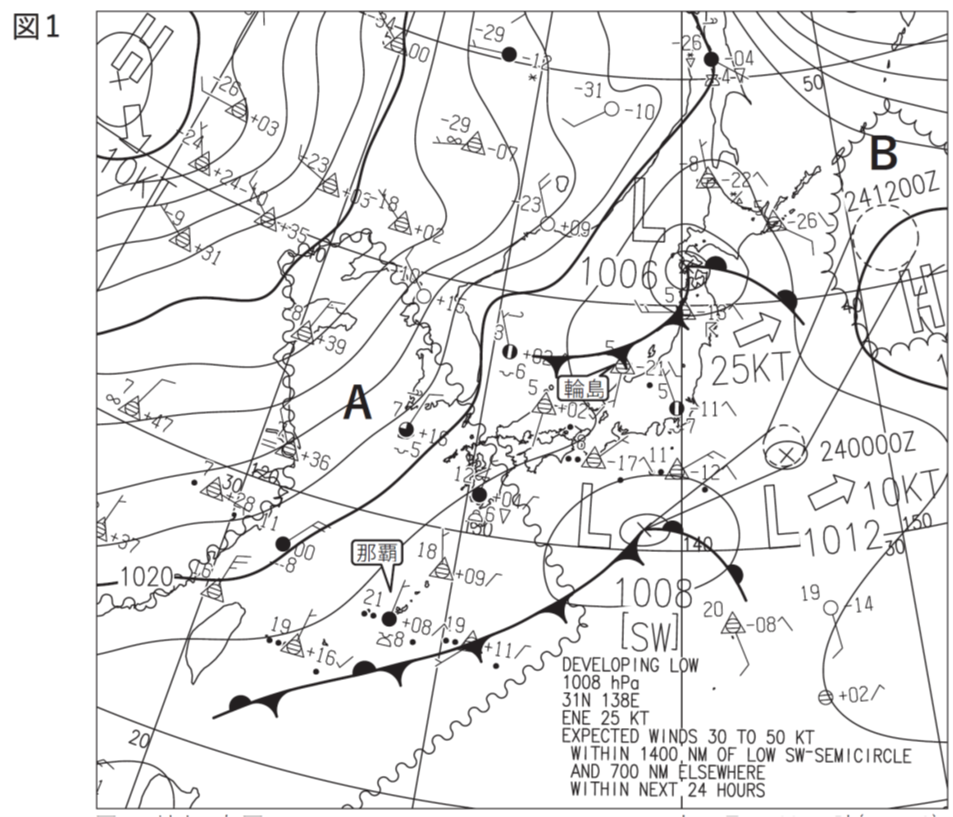 Bは境界線の種類からFOG[W]となります。暖湿空気が北上し、冷やされることで霧が発生し、海上濃霧警報が出されることはよくあります。