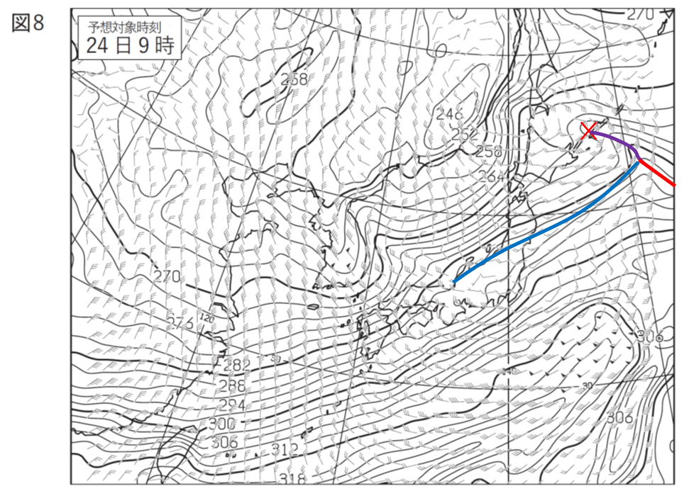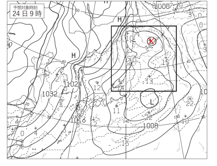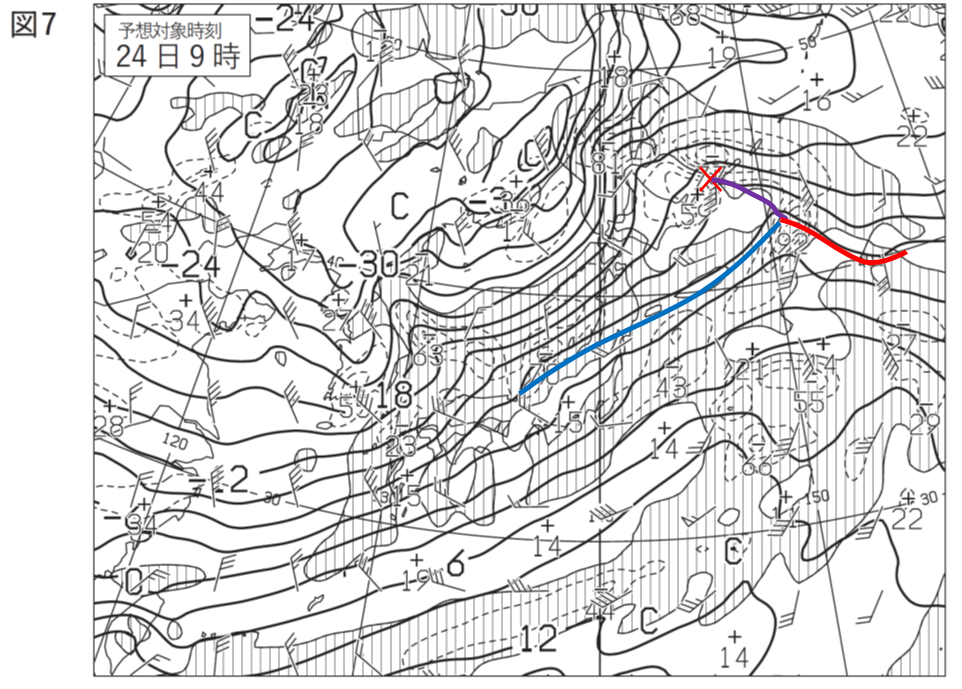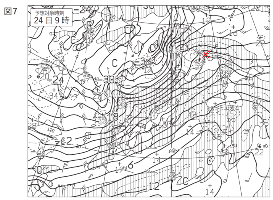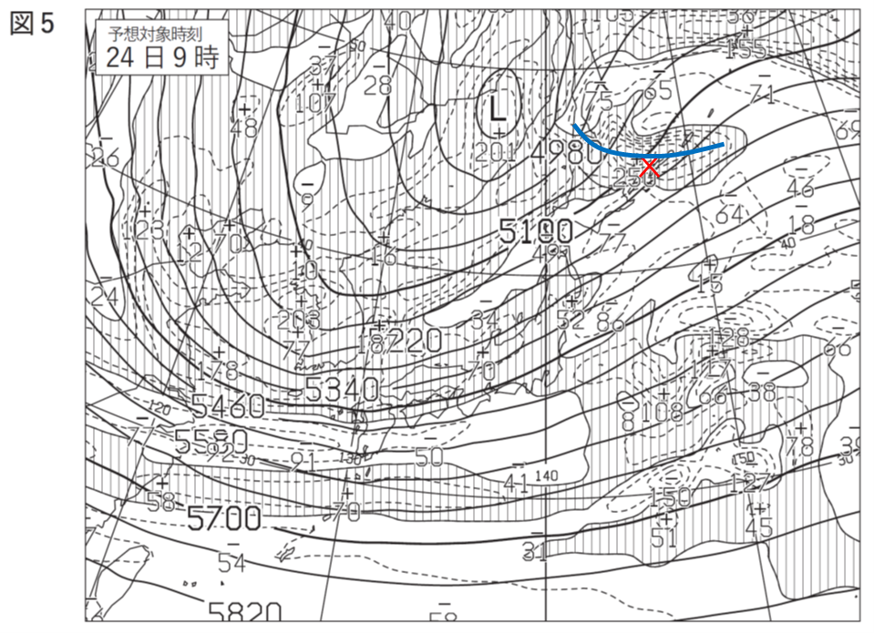 ②まず、問題となっている図4(23日21時)ではなく、図5(24日9時)を見ていきます。この時間帯の低気圧は①より最盛期を過ぎていそうなので、低気圧を少し追い越したあたりにトラフがあるのではないかと見ていきます。
