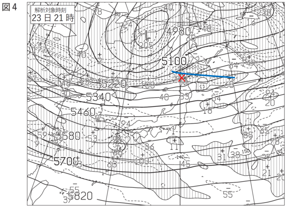 図5よりも少し南西側(強風軸の風上側)に正の渦度域の尾根がありますのでこれをトラフとします。東経140°と交わるのは正の渦度極大点(+233)付近なので5160mもしくは5220mとなります。