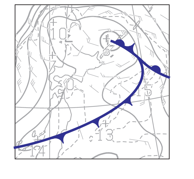 等温線集中帯南縁と風の風速シアーをもとに前線を解析します。等温線集中帯が低気圧中心から離れ、中心付近で等温線が上に凸となりくさび形に入り込んでいますので、その部分は閉塞前線でつなぎます。また閉塞前線の南西側は、北東側に比べて温度が高いため、寒冷前線は閉塞したのち、温暖前線のうえに乗り上げるような形「温暖型閉塞前線」となります。よって「入」の形のような前線となります。