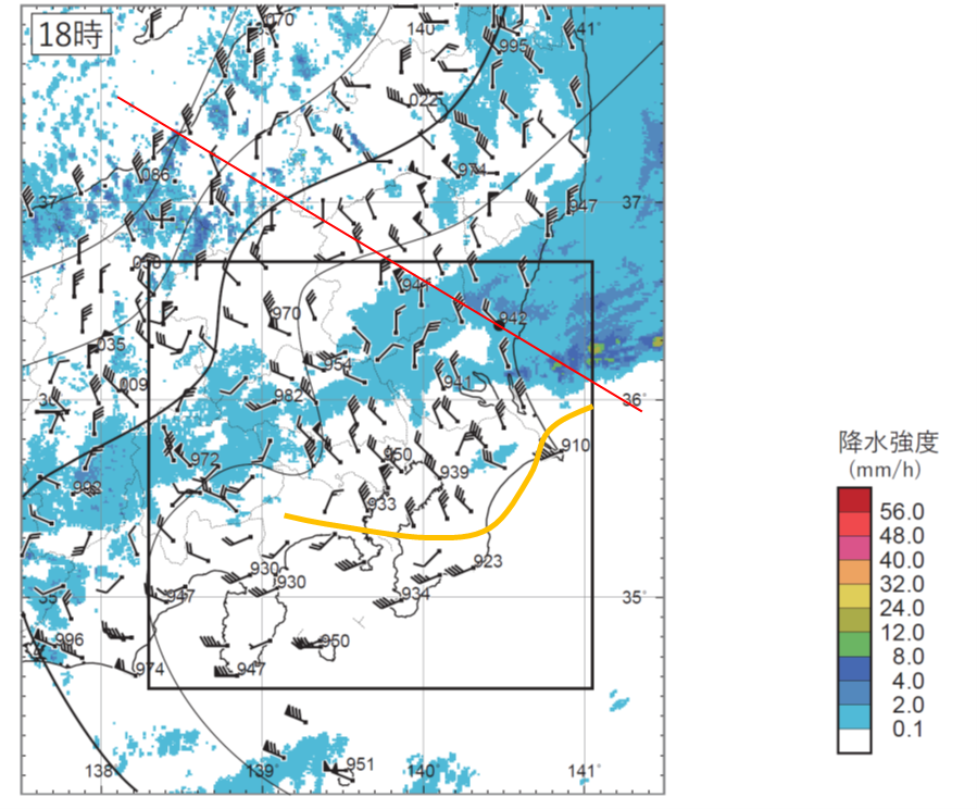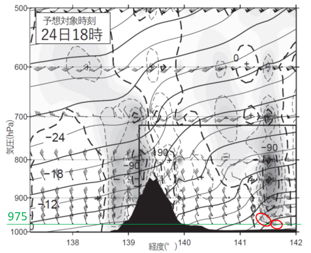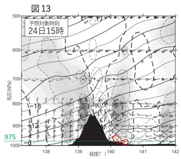 図13の975hPa面では東経140.25°と東経140.50°を境に北西の風と南西の風に分かれています。問題文にはこのうち図の左側の地点の経度を答えるように指示がありますので、15時については、東経140.25°となります。