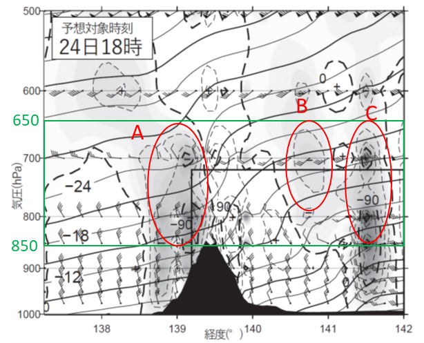Bは地上前線からやや北西側、Cは地上前線付近です。前線面は北西側に行くほど高くなっており、Bの上昇流域が比較的高い位置にのみ認められるのと整合がとれますので、Bは上空の前線面であると言えます。Cについては、地上前線付近なので地上付近の強い風による収束によるものです。