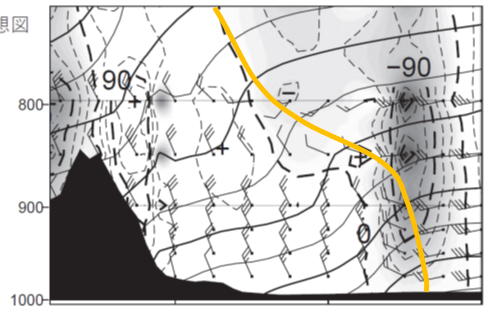 ここで図13で下に示した領域では等温線が立っており、温度の低い左(北西)側と、高い右(南東)側の差が大きいことがわかり、前線の特徴を示しています。また風向についても、北西風と、西北西~南西とで水平シアーも確認できます。